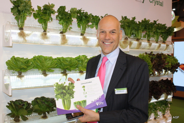 Jan Doldersum van Rijk Zwaan toont de nieuwe mini-selderij die op hydroponic wordt geteeld.