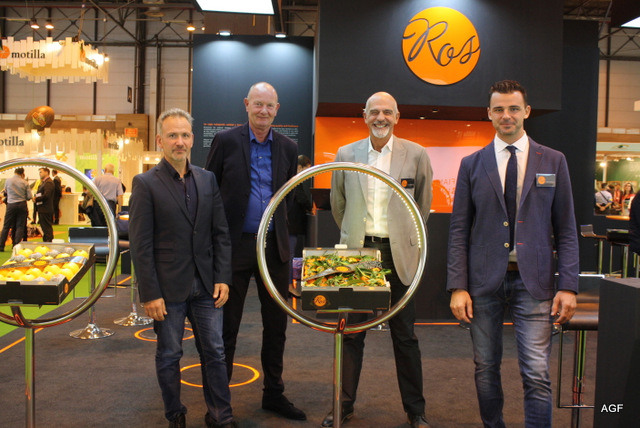 William Willems (Central Fruit) en Adriaan Breeuwsma met Juan Pedro en Lionel Beltran van de Spaanse citrusteler V. Ros