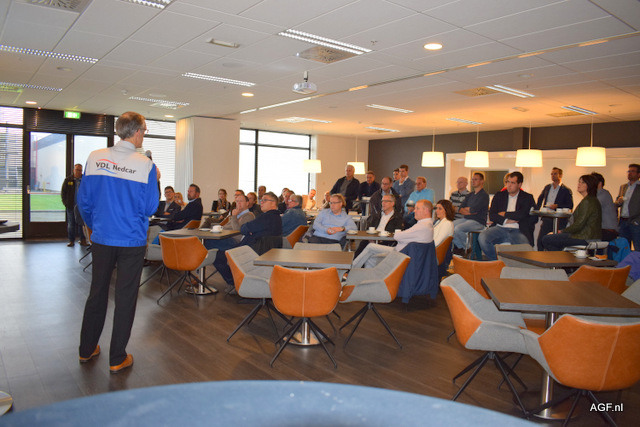 Ron de Greeff spreekt de deelnemers toe en bedankt VDL Nedcar voor het bezoek