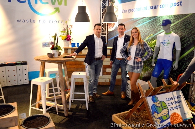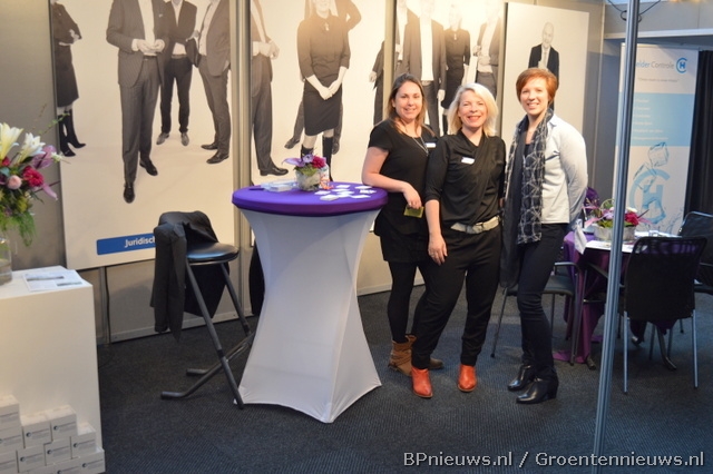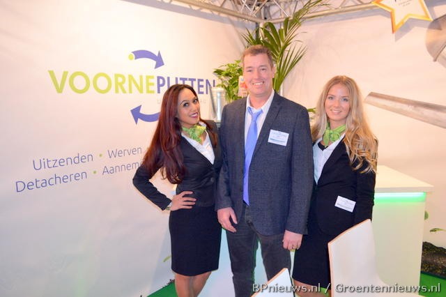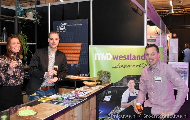 "GJ brengt MVO naar de beurs", aldus Nicolet van Veen (Let's Photograph), Edwin Zuidgeest (MVO Westland) en Joep van Veen (GJ Personeelsdiensten)."