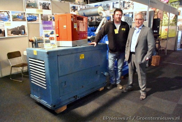 Andre van der Voort en Hans Boer staan bij een stroomaggregaat uit vergane tijden...