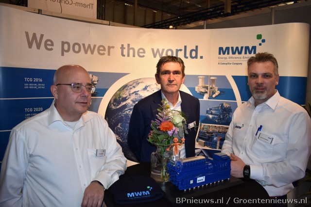 Peter van Loon, Lennard Bron, Meindert Wolters, Marco Graaf en Hans Orgers rondom een WKK-maquette van Jenbacher.
