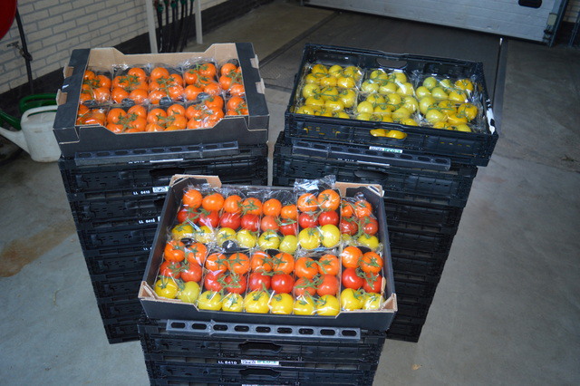 Richard van der Knaap en Frans de Smit van Rimato hadden hun oogst vervroegd, zodat de kas op tijd dicht kon vanwege TOCV. Toch was het lekker druk in de schuur.