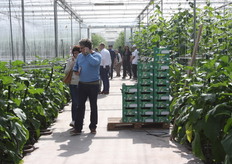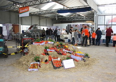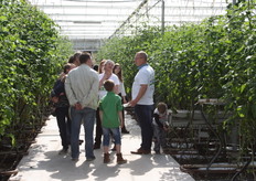 Drukte rond de stand van Biobest bij tomatenkweker L.A. Van Schie in Honselersdijk.