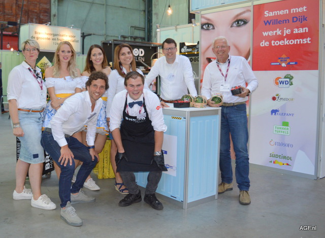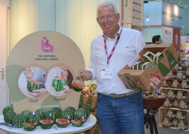 Willem Dijk toont de Kisy meloen. Deze wordt in Spanje (Murcia)speciaal geteeld voor Willem Dijk. De meloen kenmerkt zich door een kleine maat (12) waarvan er 6 in een doos gaan en 120 op een pallet. Een handig formaatje om mee te nemen naar het strand. Ondanks het kleine formaat meloen is deze lekker zoet.