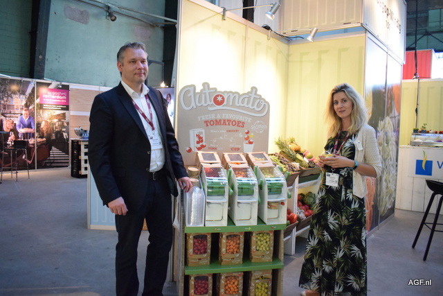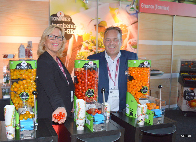 Yvonne Wichert en Edwin Timpen van Greenco (Tommies). Zij poseren bij de Tommies Tomaten Tap. Een leuk doseerapparaat waarmee een beker tomaten kan worden gevuld. Doel van dit product is om de consument aan de dagelijks aanbevolen hoeveelheid groente van 250 gram te helpen.
