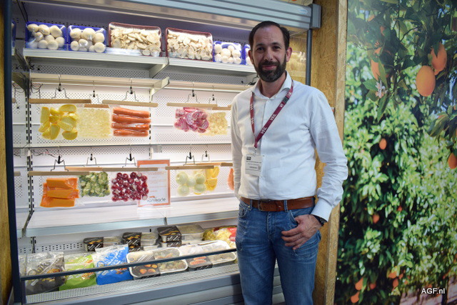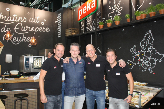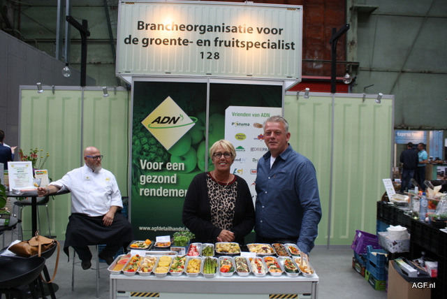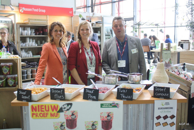 In de stand van Lukassen werd het stoofassortiment van Ranfru gepromoot. Stoofappel, appelmoes, stoofperen, Tutti Frutti en Appel Compote. Rechts Paul Dekker van Selection Foods