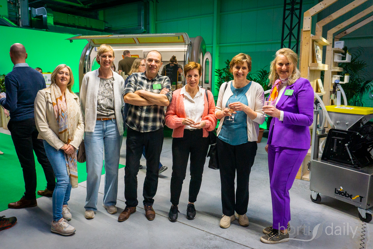Raf De Vis, Proefstation PSKW, Marc Merten, Senior vice president, Jozef Coormans van KU leuven, en Koen Neyens van VGT, met daarnaast Juliette Pijnakker en Yves Arijs, Biobest.