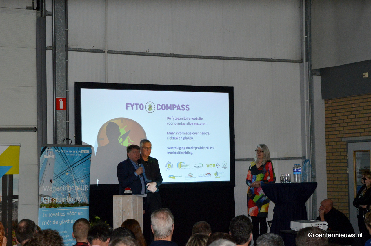 Gert Mulder (GroentenFruit Huis), Anneke van Dijk (LTO Nederland) en Sjaak van der Tak (Glastuinbouw Nederland) op het podium om FytoCompass te presenteren.