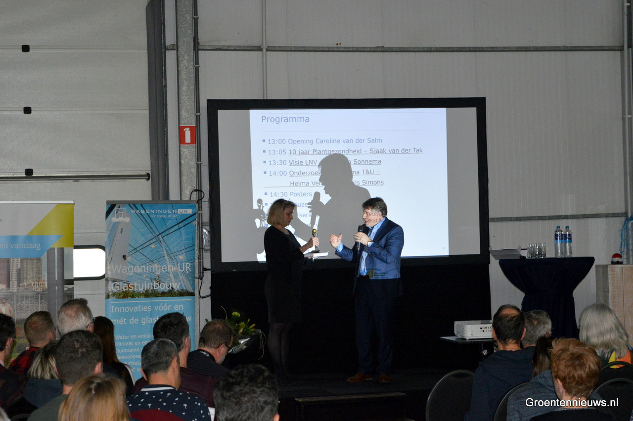 Helma Verberkt (Glastuinbouw Nederland) en Thijs Simons (voorheen van Plantum, sinds kort werkzaam bij SIA) probeerden de zaal mee te kregen met een interactieve sessie over de diverse onderzoeken die gaande zijn op plantgezondheidsgebied. Echte interactie kwam niet op gang, later tijdens de posterpresentaties en workshops wel.