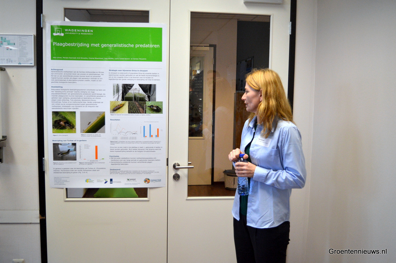 Ada Leman vertelde over een onderzoek naar plaagbestrijding met generalistische predatoren, die daardoor meer 'werk' hebben en niet bij vlagen werkloos zijn. De generalistische roofwantsen van de families Anthocoridae en Miridae zijn omnivoren en kunnen daardoor leven van zowel prooien als plantmateriaal. Omdat het plantmateriaal bij voorkeur niet opgegeten dient te worden, is bijvoeren gewenst.