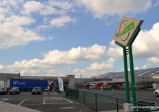 Wie tijdens de speeches over efficiënt gebruik van ruimte en energie achterom keek, zag de pijp van afvalverbrandingsoven MIROM die voor restwarmte gaat zorgen waarmee de kas verwarmd kan worden.