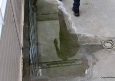 Na de plenaire presentatie over waterlekkage was de fotograaf wakker geschud. Een plasje water, even extra aandacht aan besteden. Ook water via het betonpad kan onbedoeld naar het oppervlaktewater lekken, als de afvoer niet goed geregeld is. In het World Horti Center ongetwijfeld wel. Afvoeren op het riool of gecontroleerd opvangen van water mag.