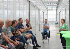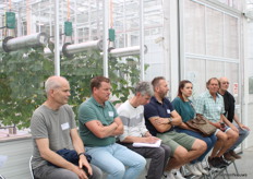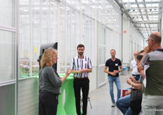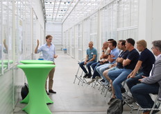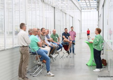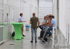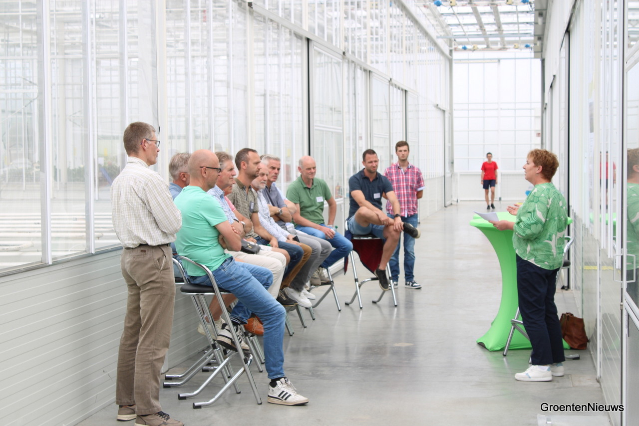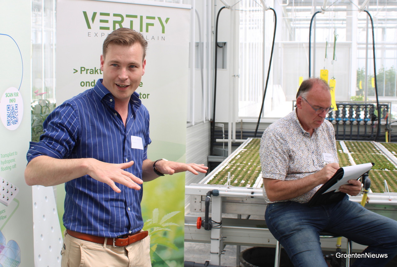 Bas Bekker geeft uitleg over hoe bij de teelt op water op tafels er een microklimaat onder de trays ontstaat door de tafel af en toe ook droog te laten vallen. Daarmee denkt men het probleem met wortelexudaten in de spinazieteelt opgelost te hebben. Op de achtergrond maakt Daan Verbeek van Koppert notities.