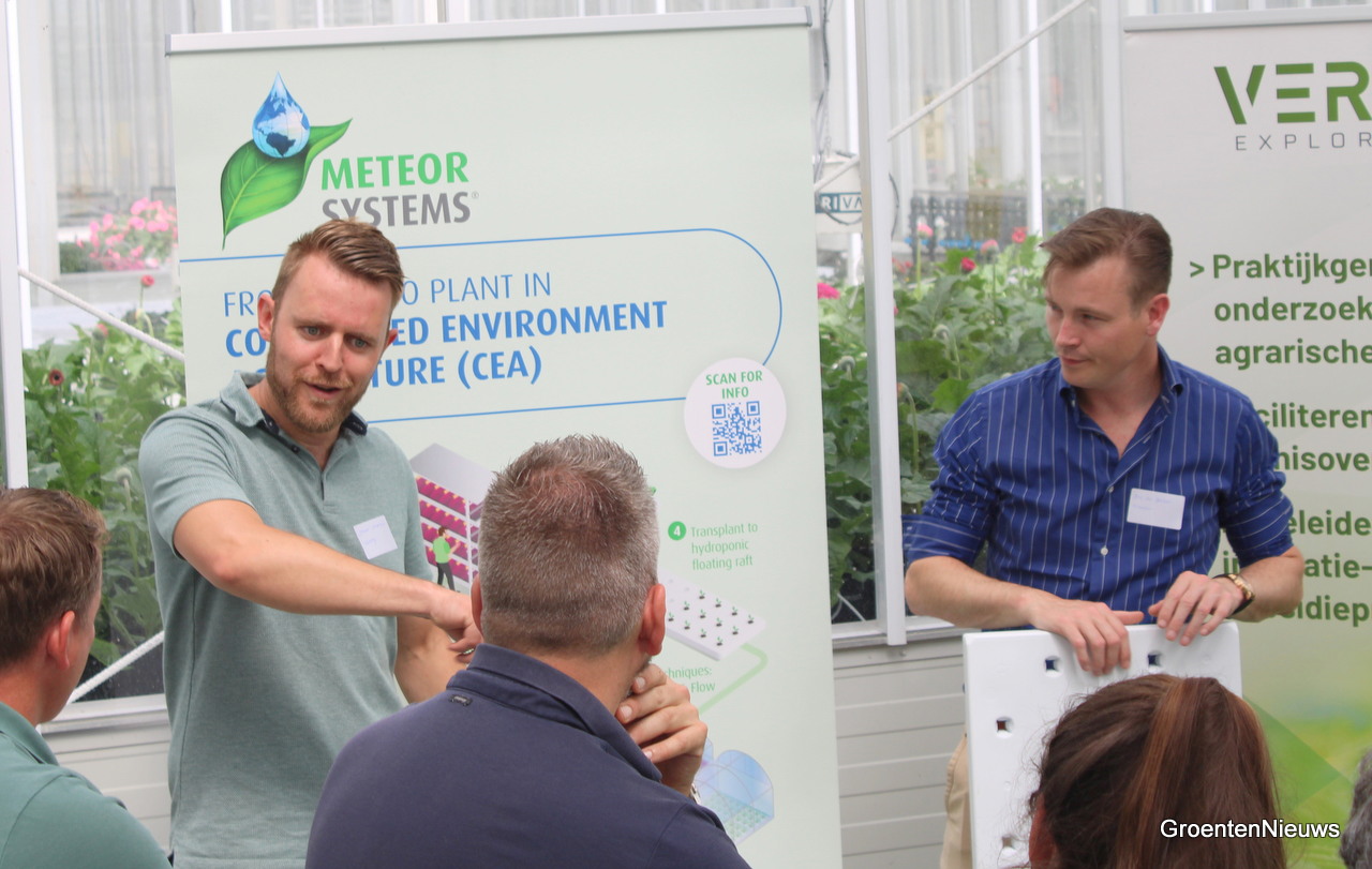 Jasper Schermer van Vertify en Bas Bekker van Meteor Systems bespraken de teelt op water en de mogelijkheden van een nieuw teeltsysteem, op tafels.