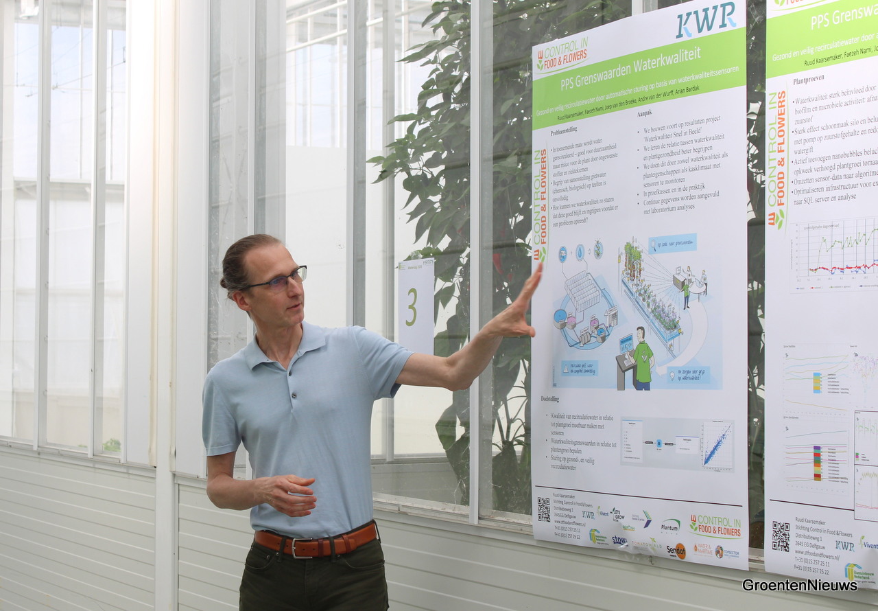 Joep van den Broeke van KWR (hier op de foto) en André van der Wurff, per 1 augustus de nieuwe Business Unit Manager Westland bij Vertify (niet op de foto) bespraken samen onderzoek naar grenswaarden voor waterkwaliteit. In het PPS-project gebruiken de onderzoekers veel sensoren in de hoop correlaties te kunnen ontdekken tussen waterkwaliteit en plantkwaliteit.