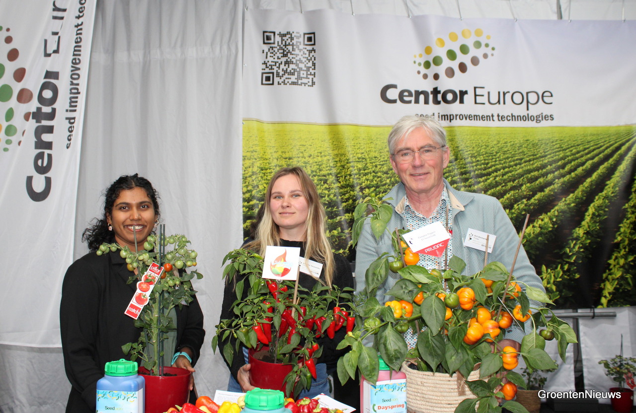 Anushka Deshpande, Viktoriia Taranenko en Ard Ammerlaan van Prudac bij hun planten die de stand van Centor Europe opfleurden.