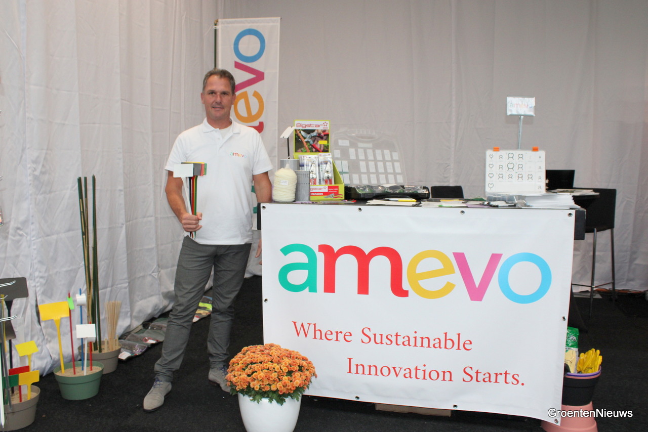 Nieuw op de beurs: Amevo, met een breed assortiment handige producten voor onder meer veredelingsbedrijven. Arjo van Dis laat bordjes zien, die het bedrijf met eigen matrijzen produceert.