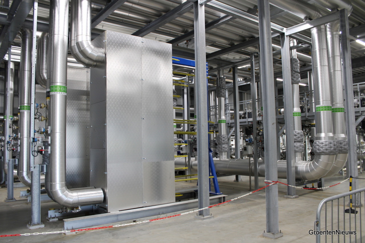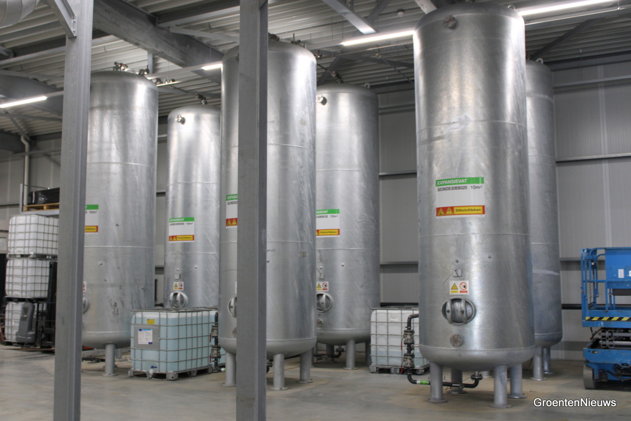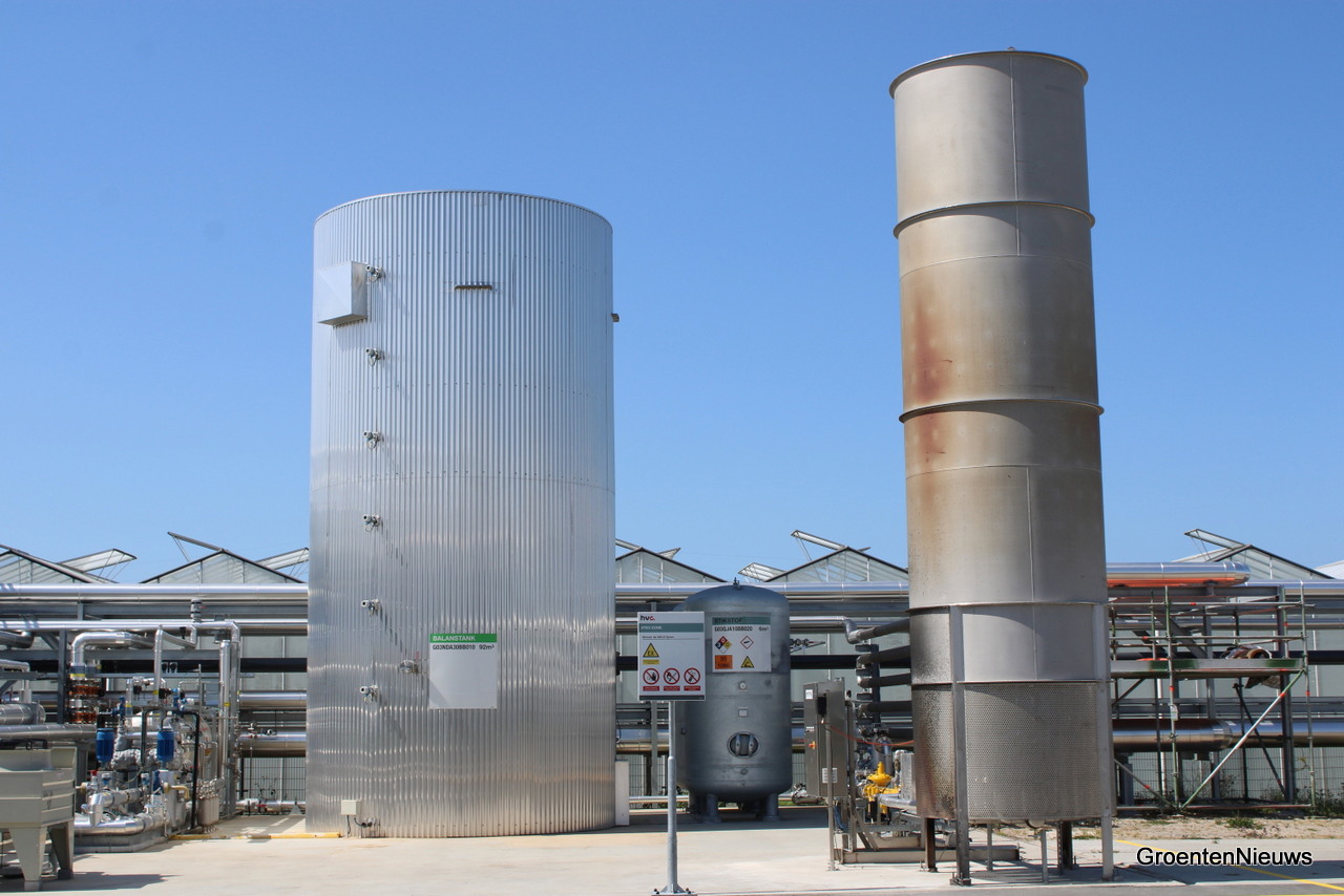 De balanstank links zit vol warm water, variërend in temperatuur. Met die tank, zoals de naam al doet vermoeden, wat gebalanceerd worden als de afnames van tuinders daarom vragen.