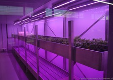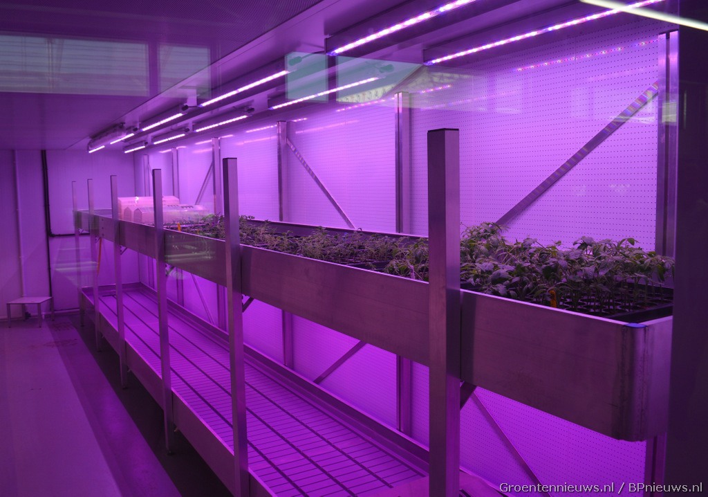 Eén van de drie klimaatkamers waar met LED-belichting getest kan worden welk spectrum voor welk gewas en bij welk gebruik het beste werkt.