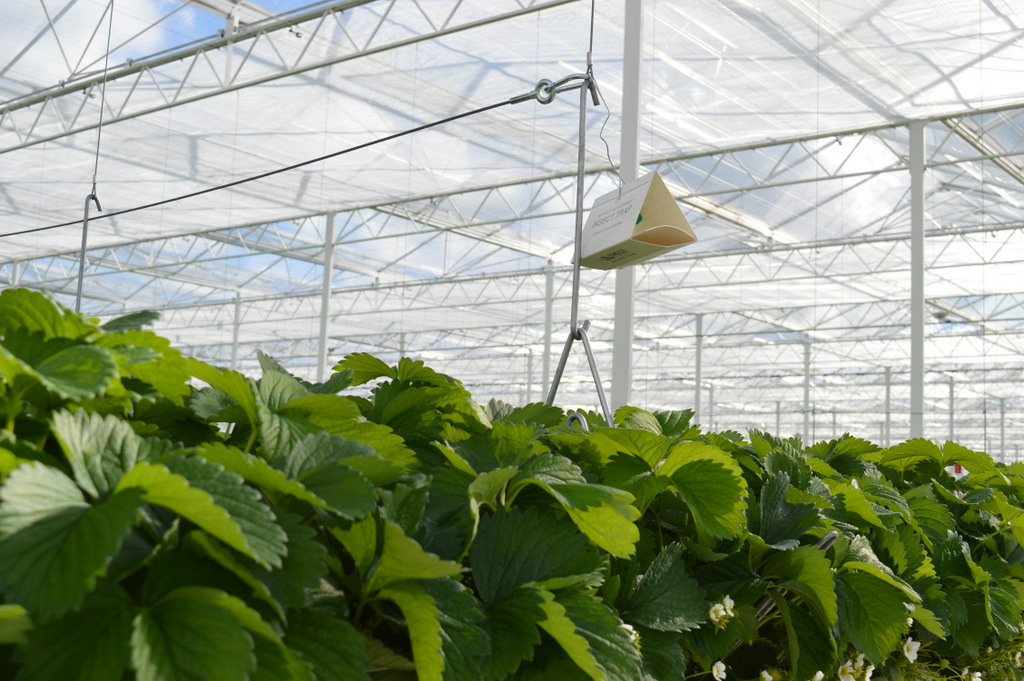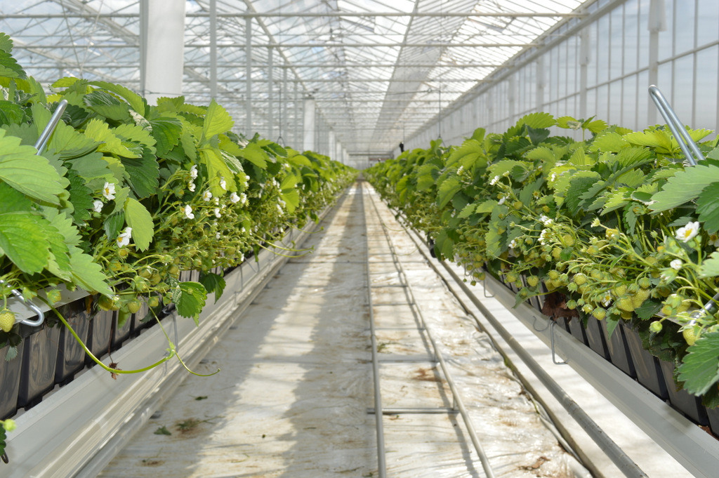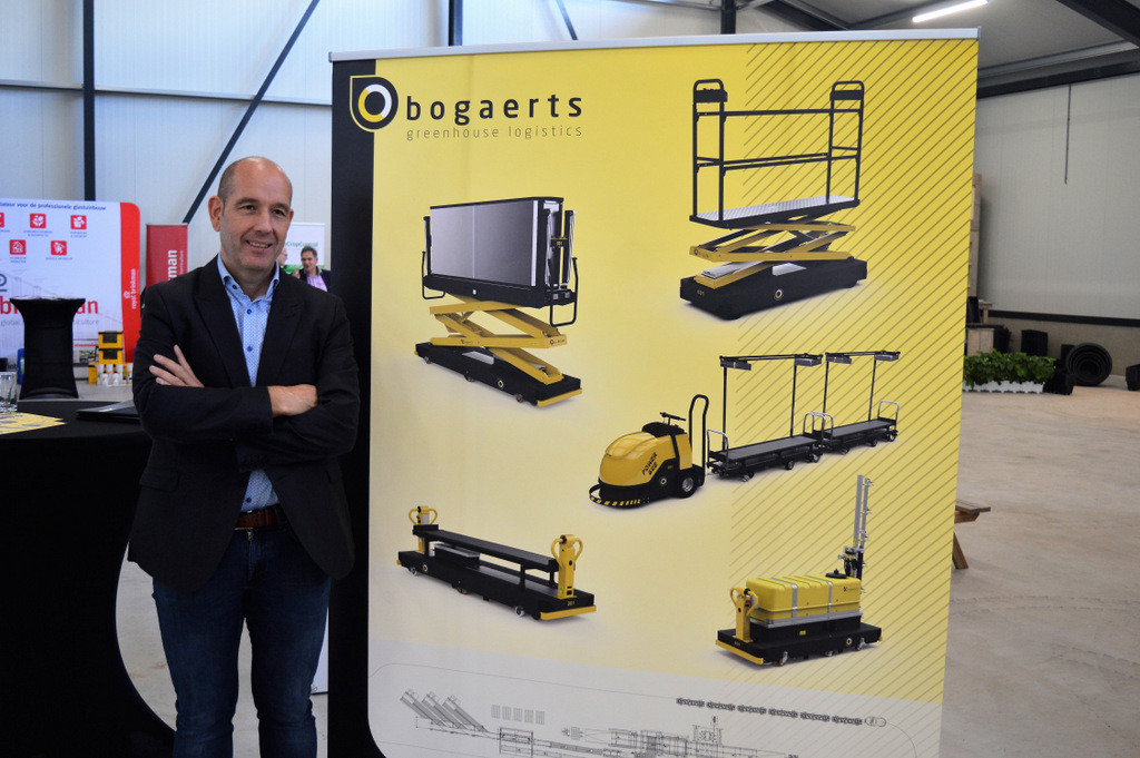 Joris Bogaerts (Bogaerts Greenhouse Logistics) verzorgt intern transport en leverde een spuitmachine die onder de aardbeien doorrijdt om gewasbescherming in het gewas te kunnen aanbrengen.