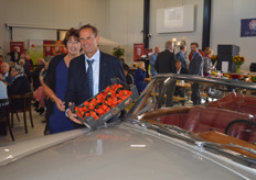 Gijbert met zijn vrouw bij de auto waarmee zij spectaculair de kas binnen kwamen rijden.