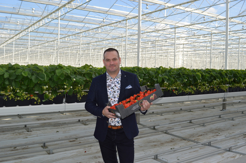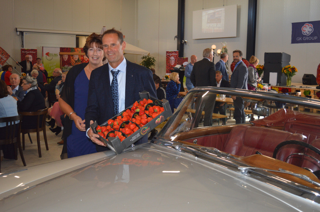 De trotse winnaar van het eerste kistje aardbeien dat voor 5820 euro geveild werd en waarvan de opbrengst naar Stichting Hospice De Samaritaan gaat.