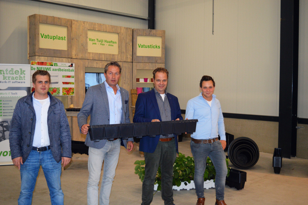 Arjan van Leeuwen, Frits van Duijn, Nico den Hartog en Gerard van Tuijl (VAn Tuijl) leverden de aardbeienbakken, extra lang (1,25 meter) en extra smal (11 centimer bodembreedte), zodat de goten smaller kunnen blijven en er minder bakken nodig zijn, dus minder arbeid.