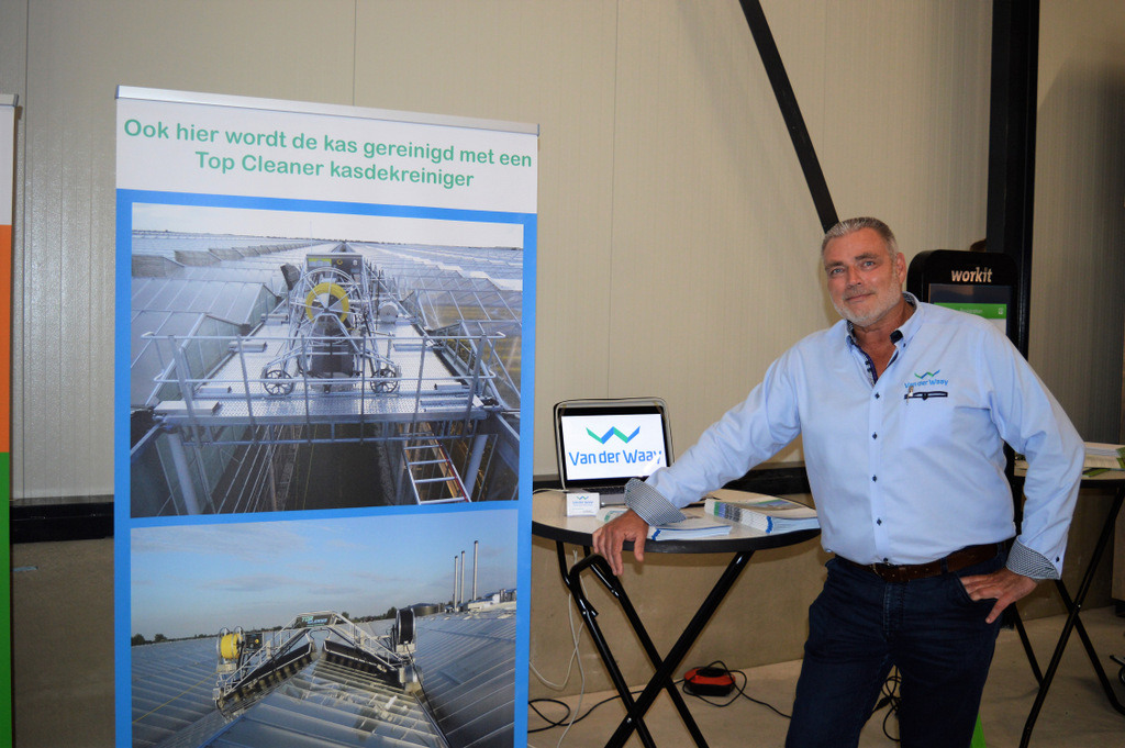 Tom Zwanenburg (Van der Waay) bij zijn stand. De Top Cleaner zal de komende jaren heel wat rondjes maken om op die manier het kasdek schoon te houden.