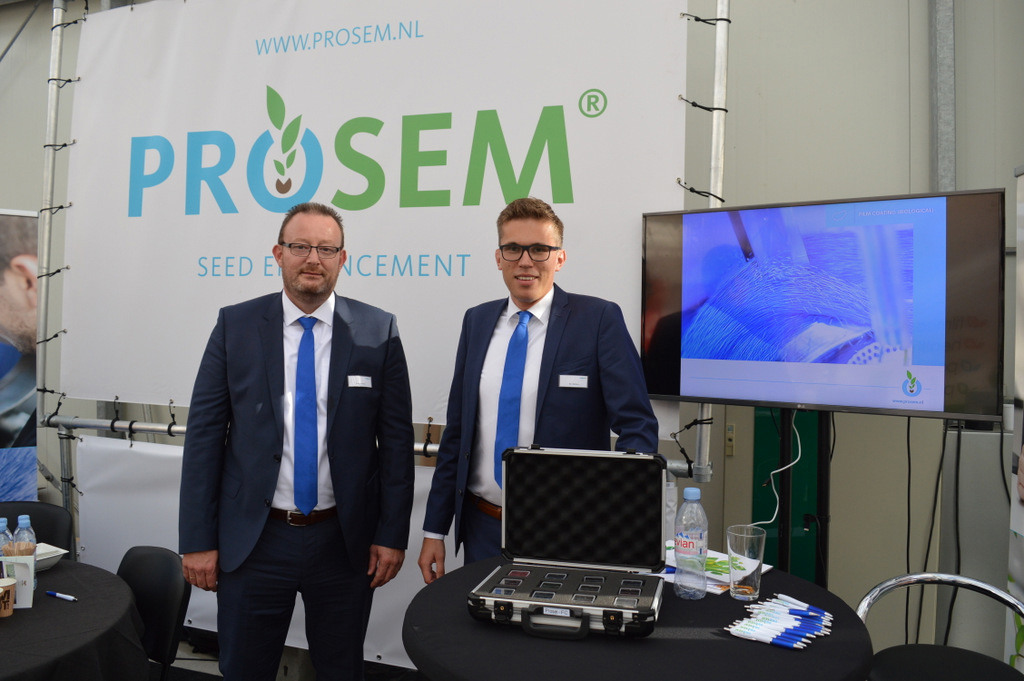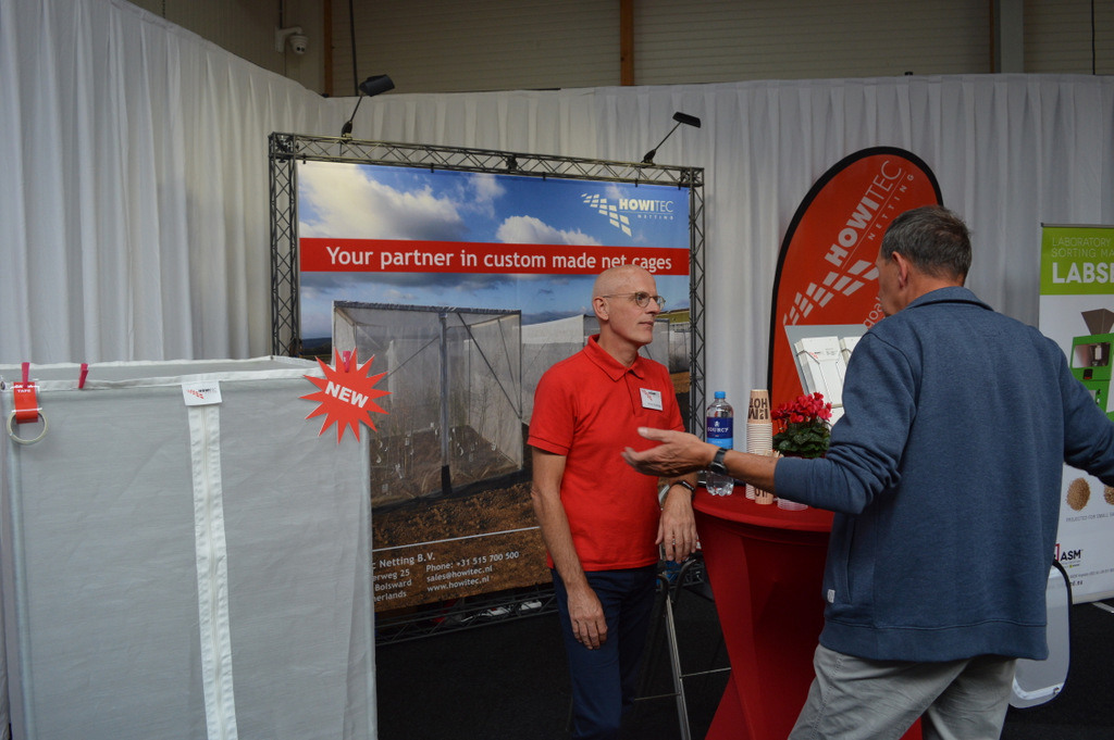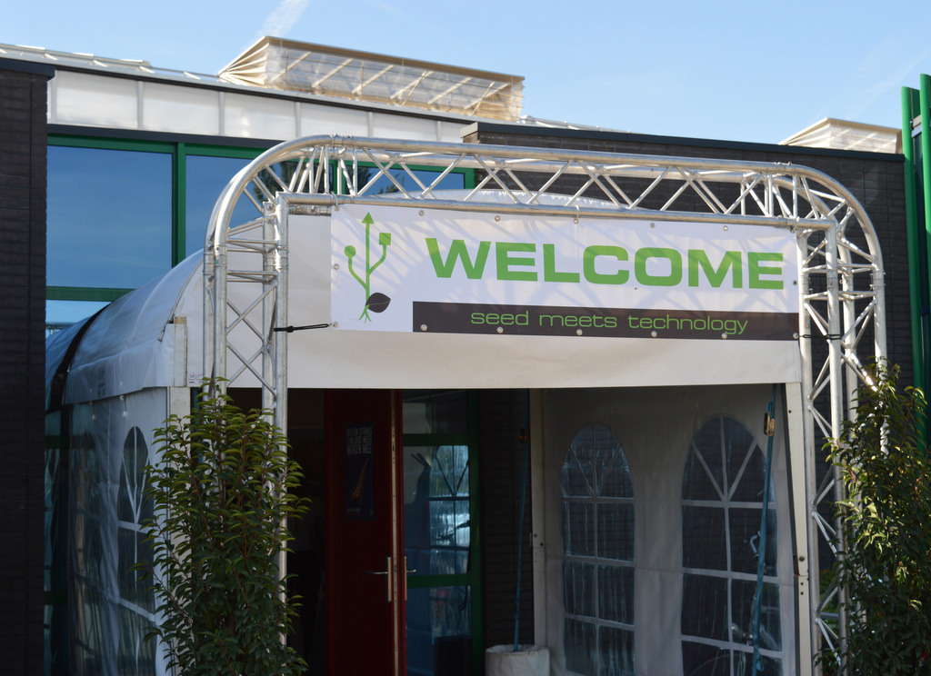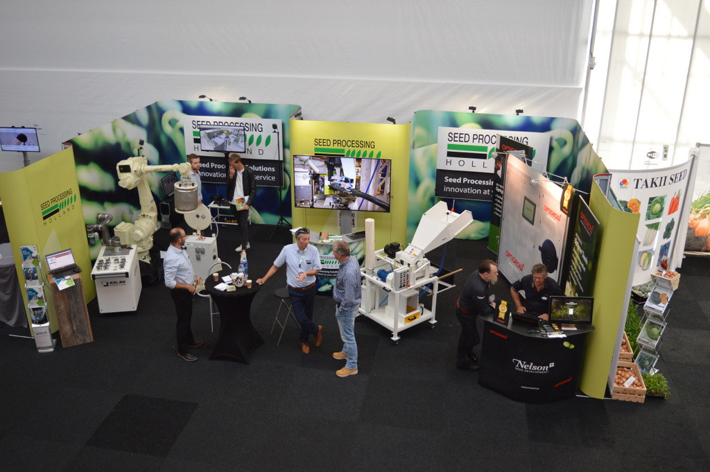 Een grote stand voor Seed Processing Holland en partners Rolan Robotics en Optigrow, dus een 'luchtfoto' met leunend op de tafel Willem van Dok van Seed Processing Holland.