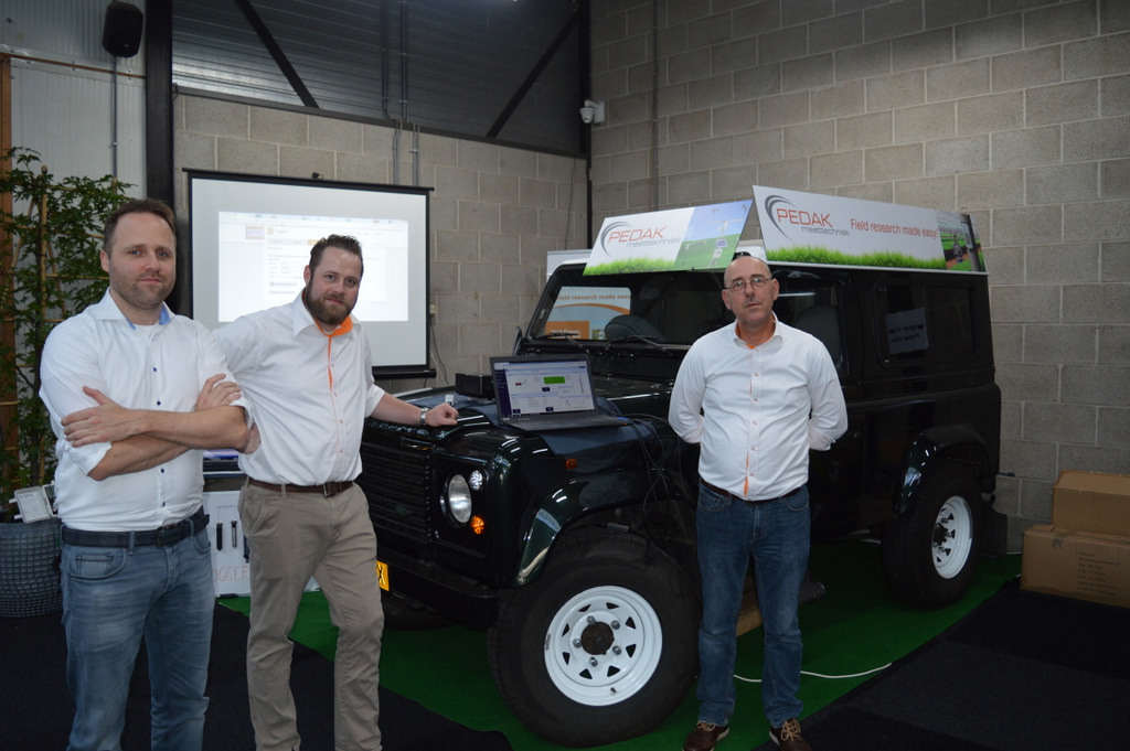 Daan Klijberg, John Tobben en Kees van der Lugt van Pedak Meettechniek op Seed meets Technology met een Landrover als eyecatcher, maar zeker ook met hun systeem waarmee draadloos field research parameters gemeten kunnen worden.