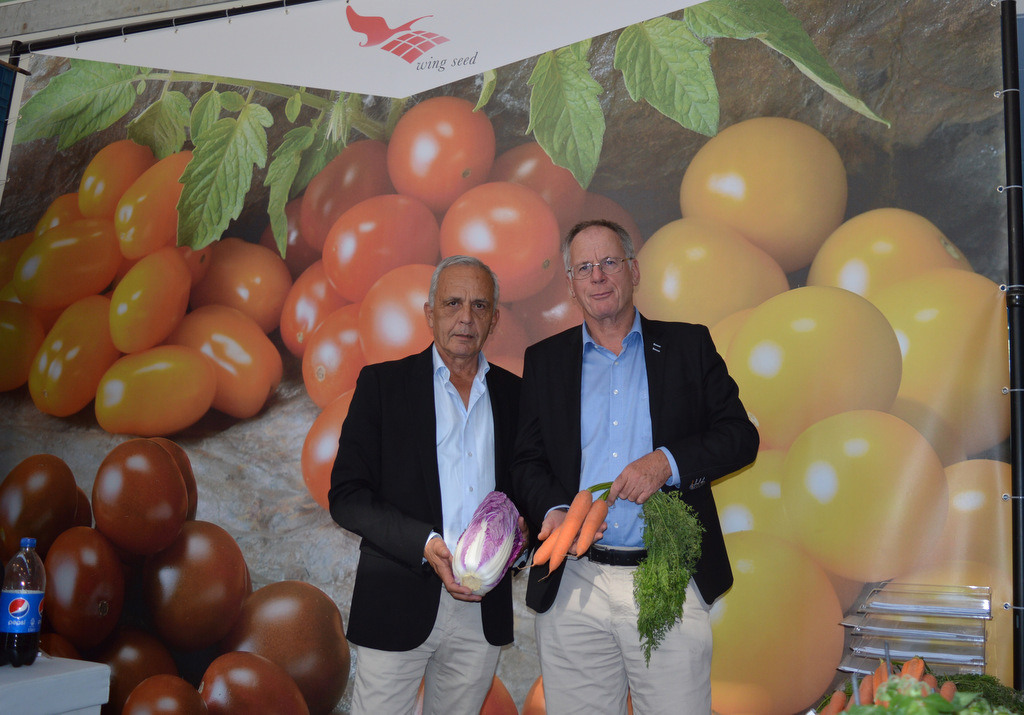 Frank Francis en Frederik Gerrits op de foto voor Wing Seeds. Frank toont het Chinese koolras Scarrossa F1, terwijl Frederik wortelras Cetan F1 laat zien. Ook in het snacktomatensegment ontwikkelt Wing Seeds zich. Zo heeft het bedrijf de snacktomaat Snack Dattorange F1 in hun assortiment.