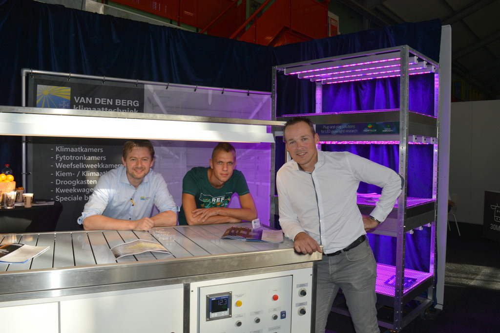 Stephen Geenen, Pascal van Meerkerk en Lennard van den Berg voor Van den Berg Klimaattechniek op de foto in hun stand waar ook een plekje was ingeruimd voor het LED's Research Rack.
