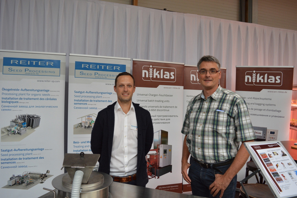 Matthias Reiter (Reiter Seed Processing) en Mathijs Wuts (Niklas) samen in hun stand. Reiter is sinds vijf jaar als engineeringsbureau bezig met seedprocessingssystemen en Niklas is actief op het gebied van coatingsmachines en weegtechniek.
