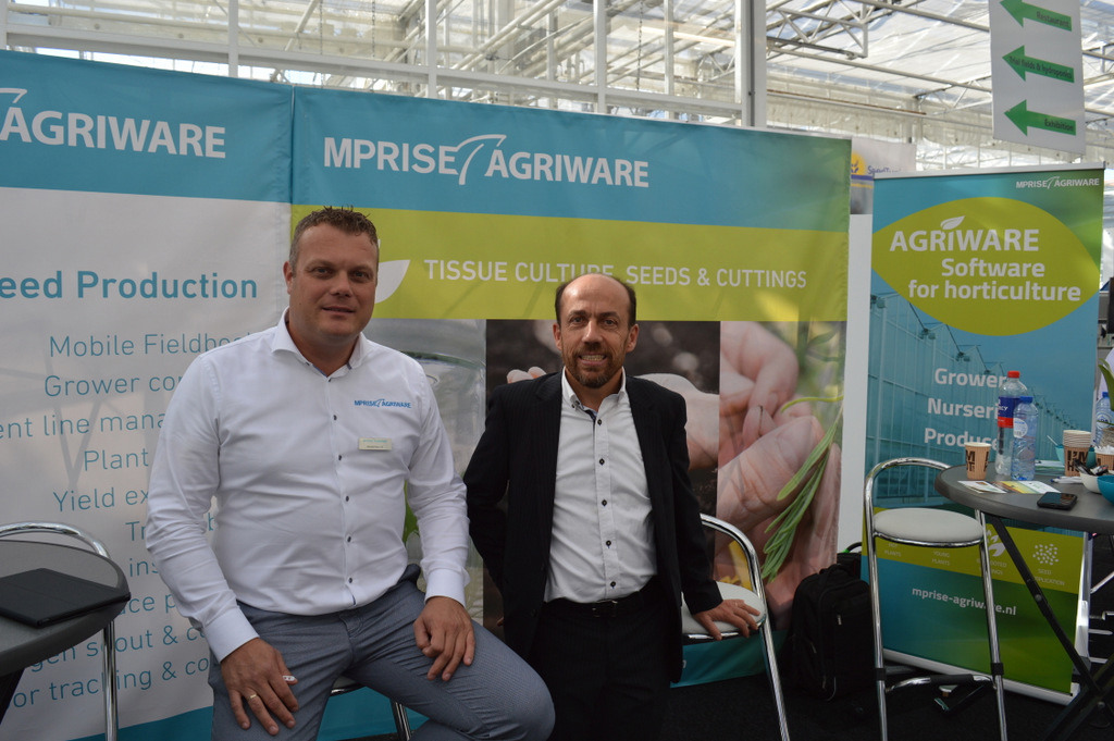 Ronald den Uil met zijn nieuwe collega Alain Lubineau die voor Mprise Agriware als vertegenwoordiger in de Franse markt aan de slag gaat. Mprise presenteerde een nieuwe Fieldbook App waarmee gewasinspecties uitgevoerd kunnen worden, waarna de gegevens draadloos vanaf een smartphone in het softwarepakket Agriware ingeladen kunnen worden voor analyse.