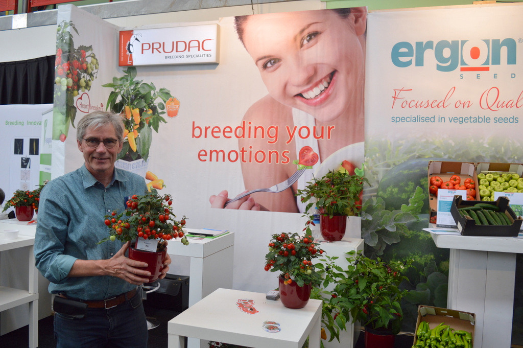 Ard Ammerlaan van Prudac met de pottomaat Ponchi F1 die naast lekker tomaten onder andere ook uniform is en goed programmeerbaar.