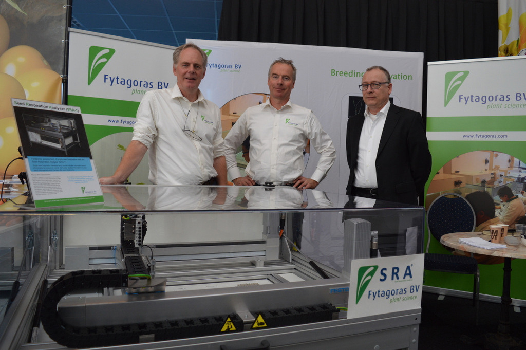 Fytagoras met drie man sterk achter een stukje hightech technologie waarmee ademhaling van zaad kan worden gemeten om dat vervolgens in verband te kunnen brengen met de zaadkwaliteit. Op de foto Bert van Duijn, Wessel Holtman en Frits van Horssen.