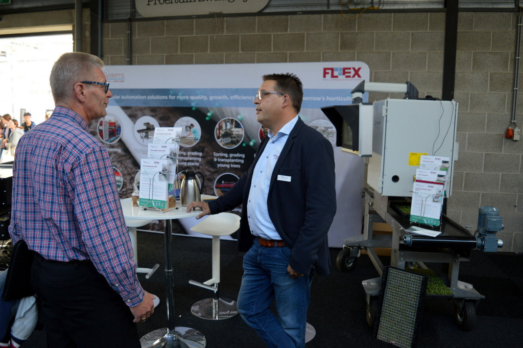 Voor de stand van Flier Systems is Pieter van Vugt (Flier, links) in gesprek met Piet van Marrewijk van Syngenta.