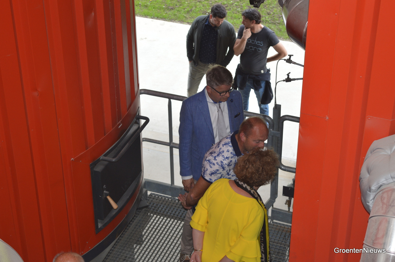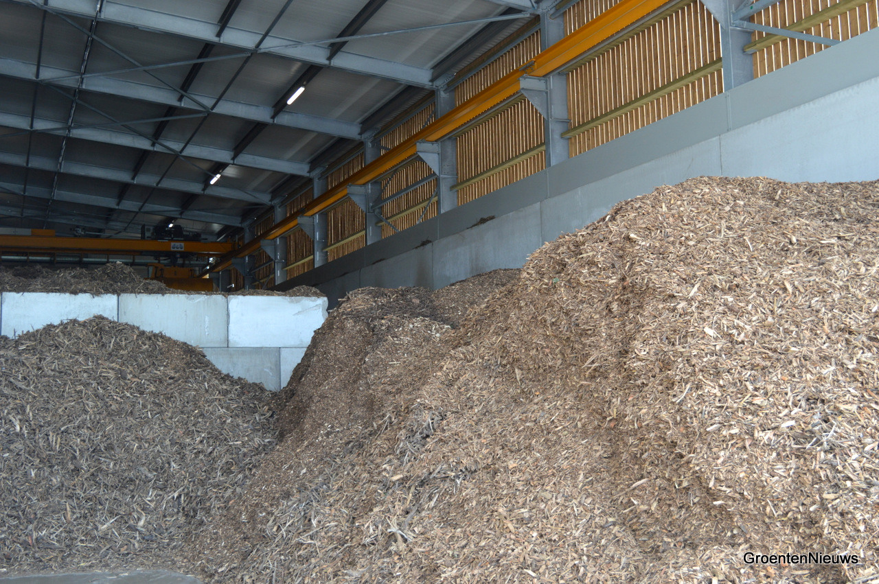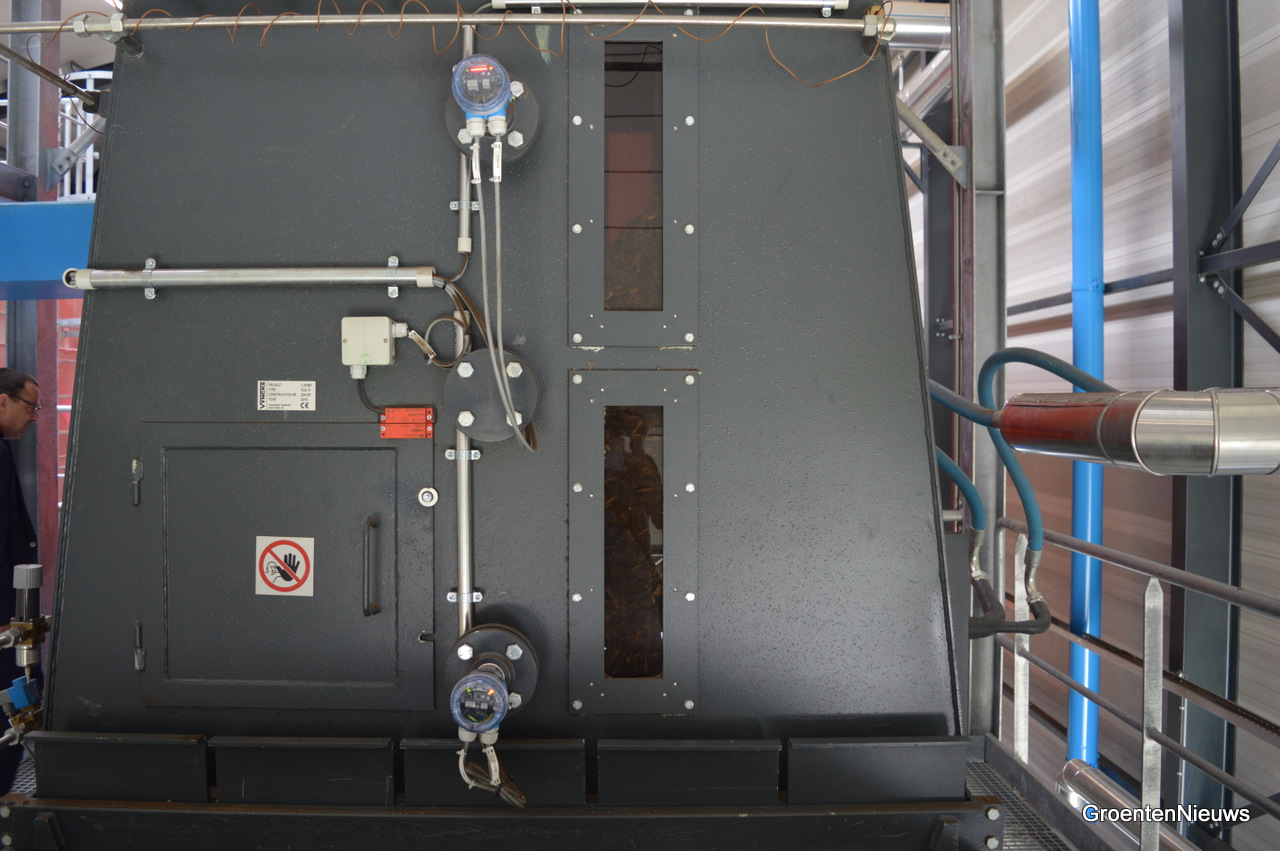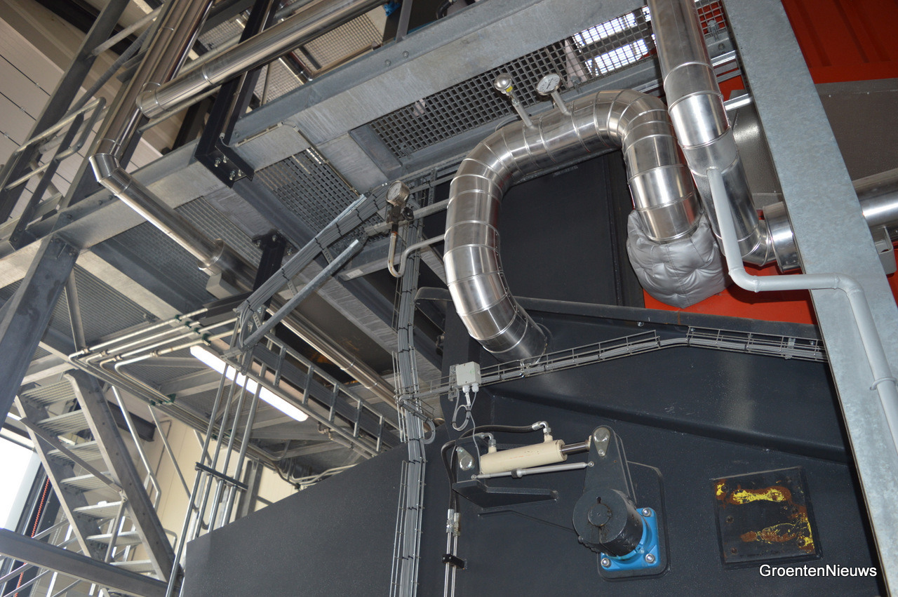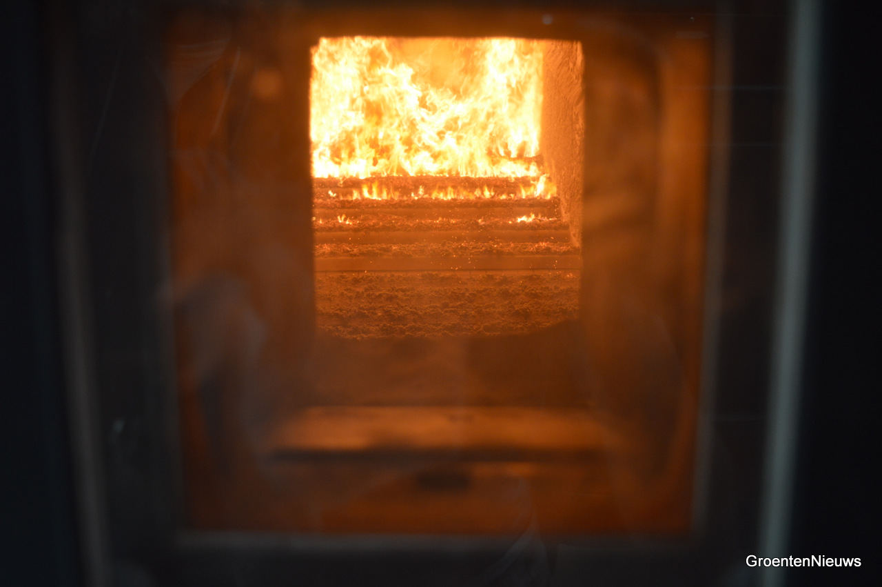 Wie goed kijkt, ziet houtige biomassa die van hieruit in de verbrandingsoven wordt geduwd.