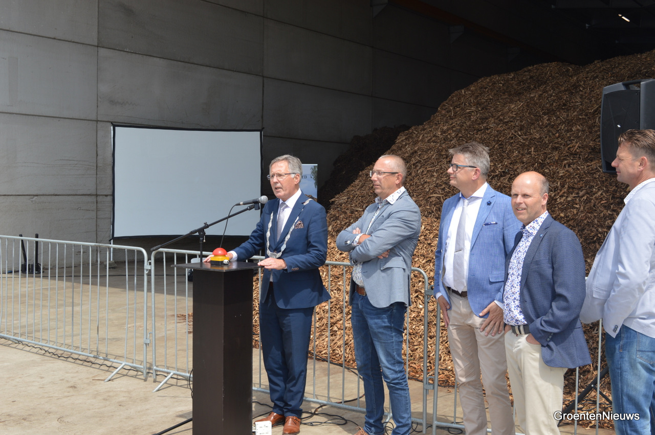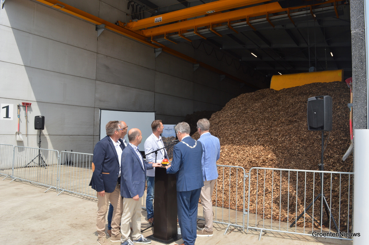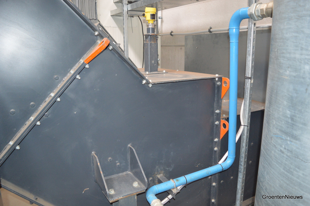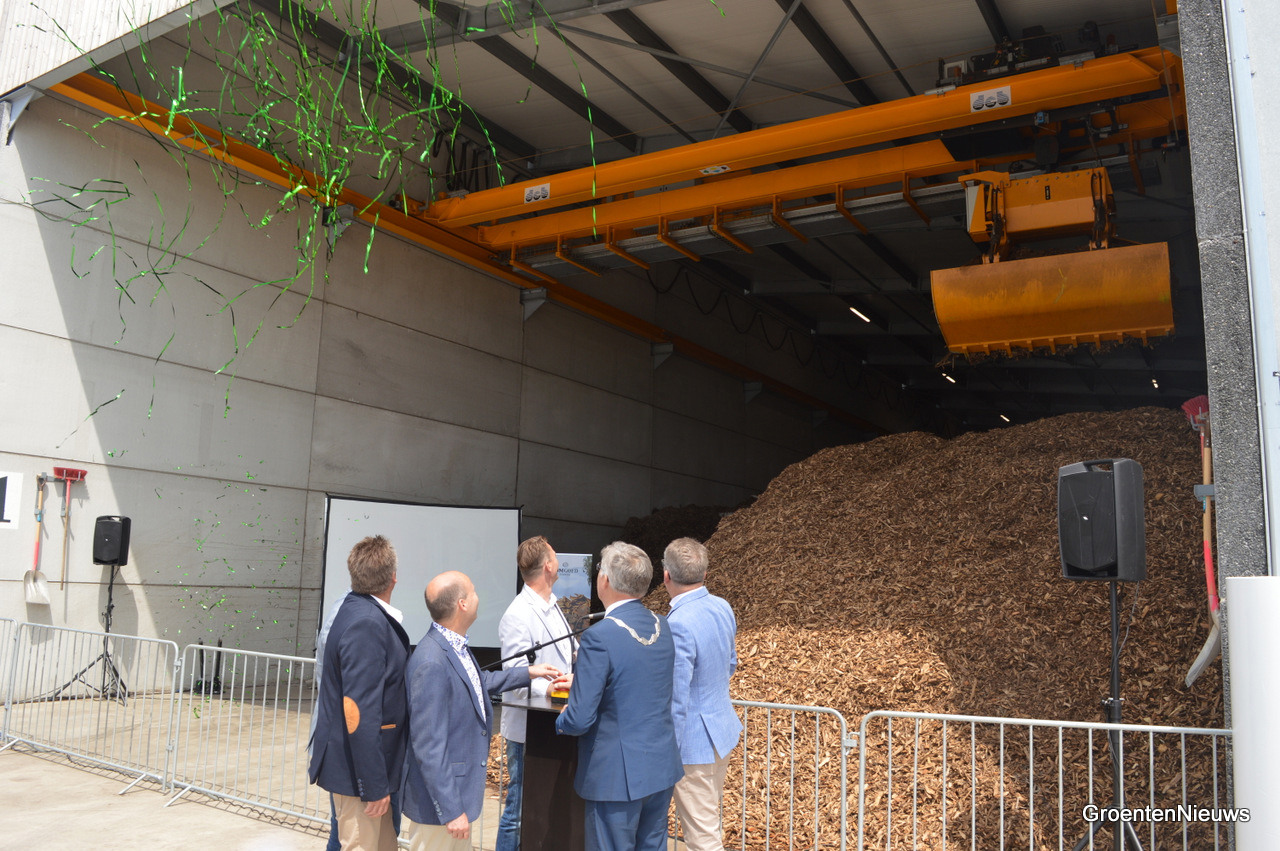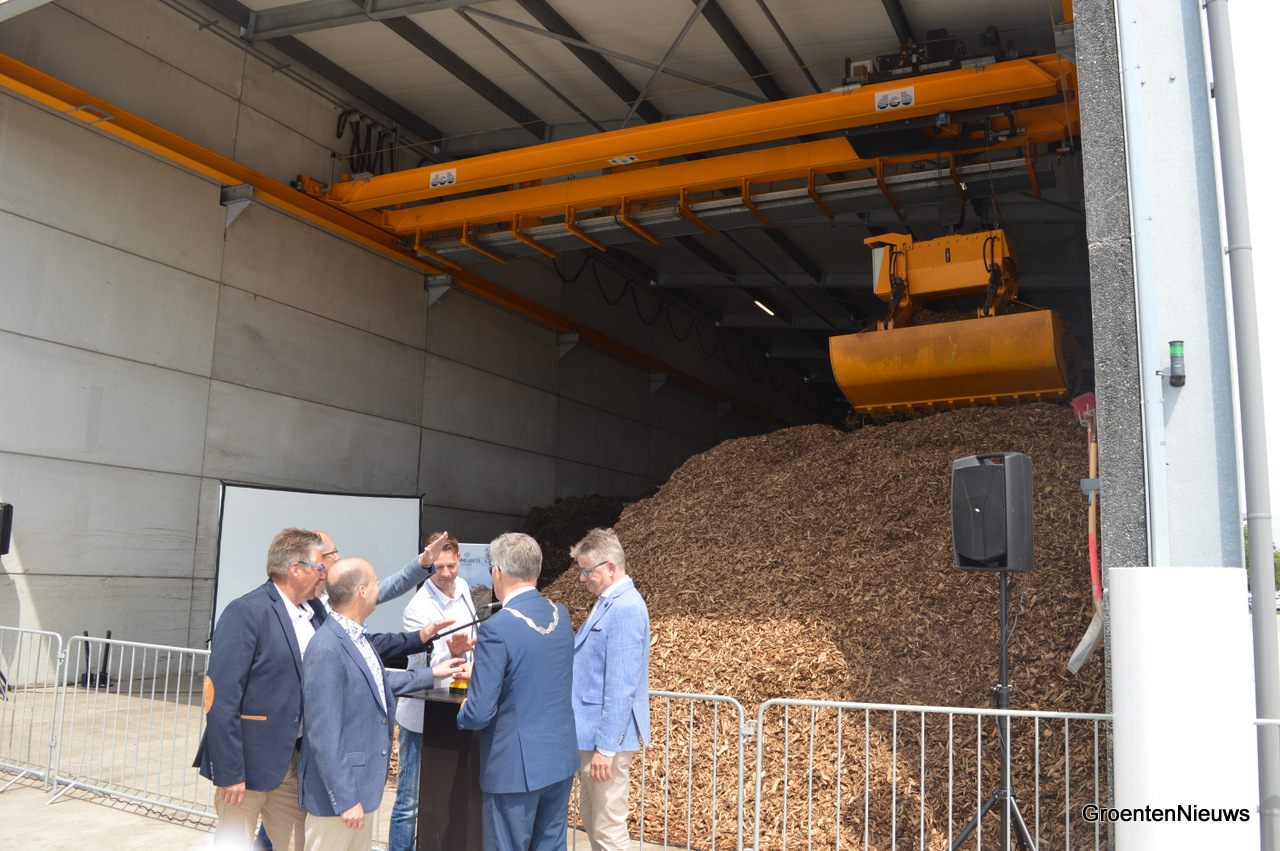 Wie goed kijkt, ziet houtige biomassa die van hieruit in de verbrandingsoven wordt geduwd.