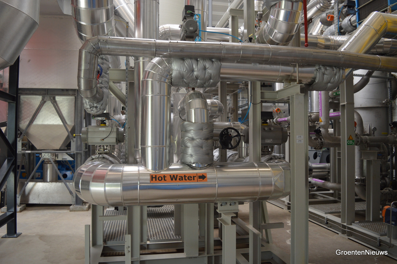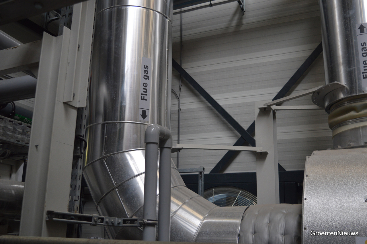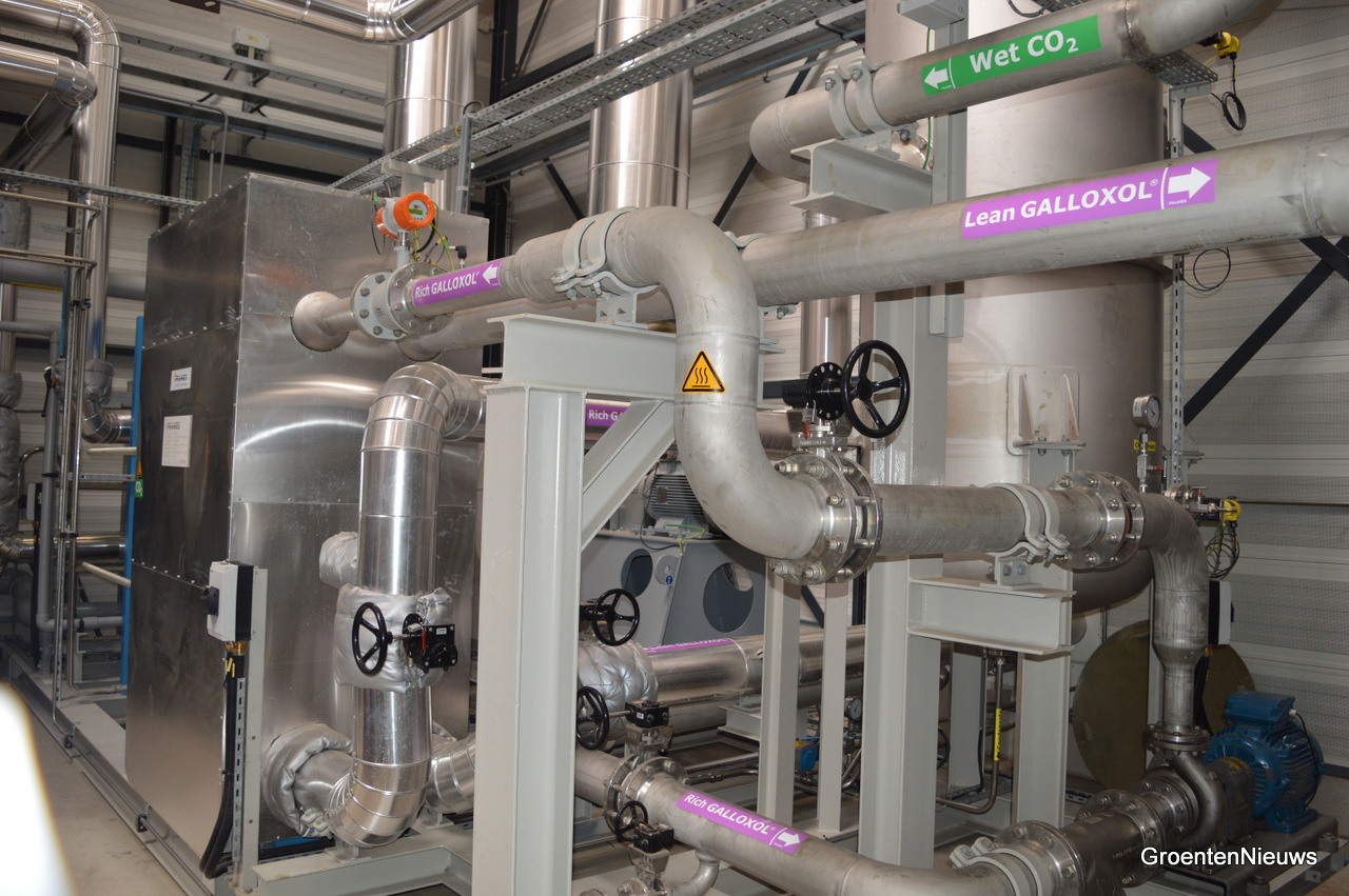 Aan de achterkant een minstens even indrukwekkende installatie. Hier wederom veel buizen en pijpen om de CO2 af te vangen en naar de opslagbollen te transporteren.
