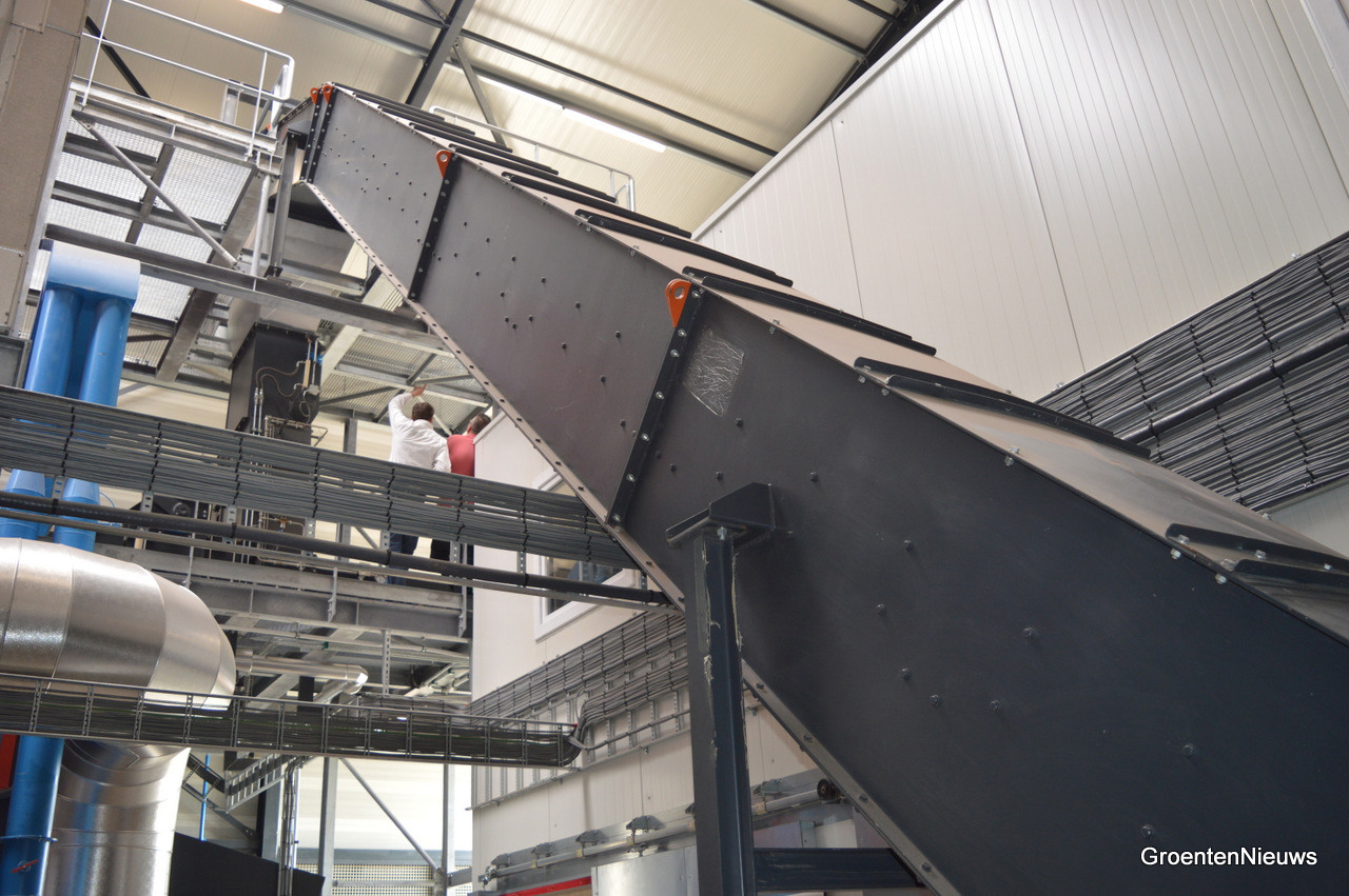 Hier komt de houtige biomassa via een transportband uit de bunker binnen, op weg naar de ketel.