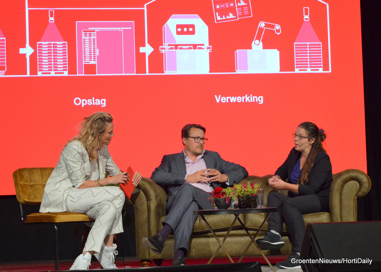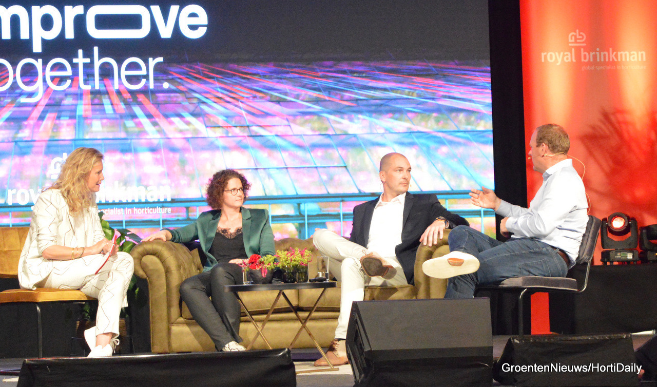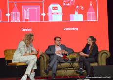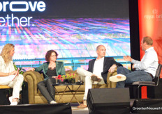 Dagvoorzitter Sophie Hilbrand, Maartje Jung en Rob Helderman van Royal Brinkman en Steven van Belleghem in gesprek over de innovatieslag die Royal Brinkman bezig is te maken.