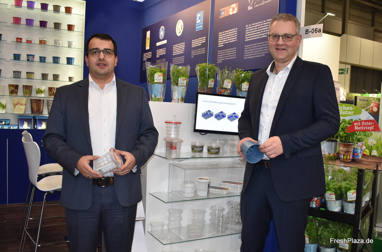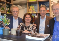 Kees Wagué, Miriam Kolen, Wouter Zieck en Geert Van de Voorde van Desch Plantpak met op de voorgrond potten gemaakt van diverse materialen, waarbij momenteel de blauwe pot, gemaakt van post consumer gerecycled plastic, extra aandacht krijgt in de markt.