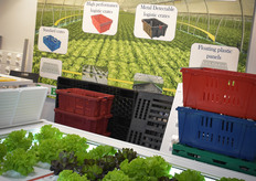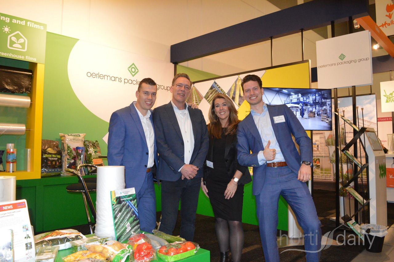 Op de stand bij de Oerlemans Packaging Groep onder meer komkommers in biologisch afbreekbaar komkommerkrimpfolie. Op de foto: Henri van Hemert (Oerlemans Plastics), Rob de Leeuw en Ellen Schreur (Perfon) en Piet van den Oord (Oerlemans Plastics)