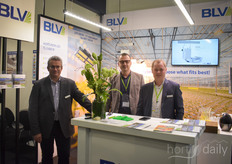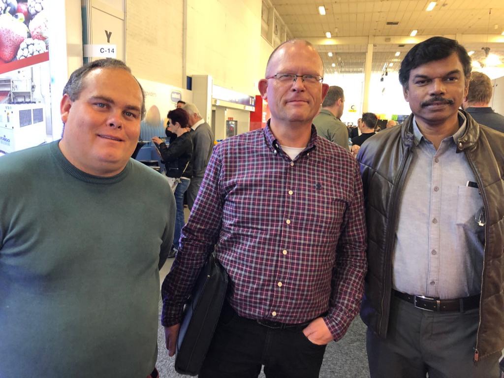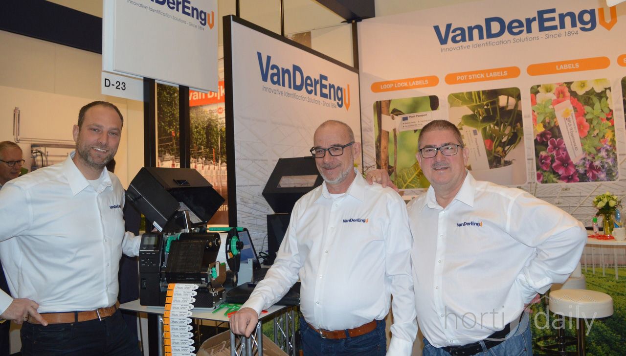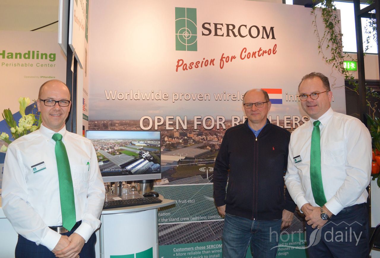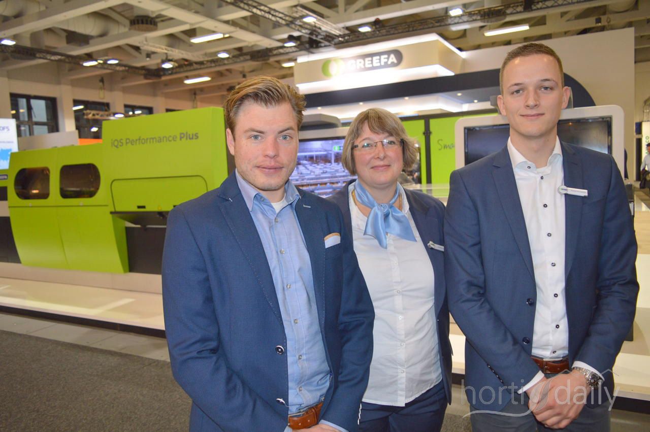 Jeroen van Leeuwen, André Funk (AgrowTec) en Eric van der Klauw van AgrowSer gespot in hal 8.1, dit jaar op de beurs tot ‘glastuinbouwtechniekhal’ omgedoopt.