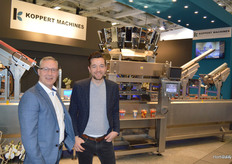 Leo van der Ven en Patrick ten Have van Koppert Machines. Achter hen de multipacker die geschikt is voor het verpakken van diverse snackgroenten. De machines ontnest, weegt en dekselt en kan zowel voor plastic als karton worden gebruikt.