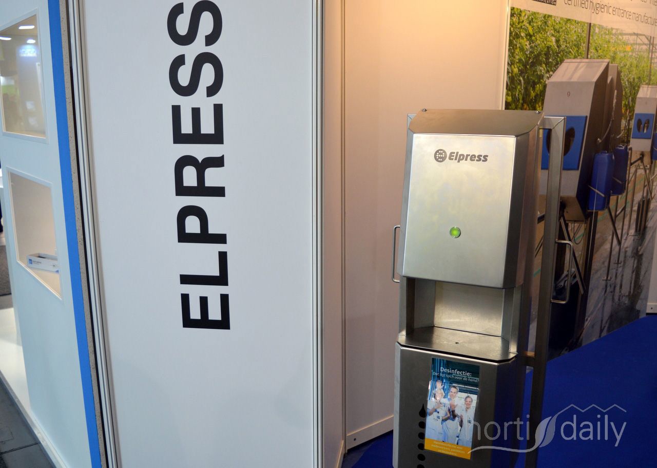 Elpress bracht een handdesinfectiepaal mee voor wie al lopend over de beurs nog even de handen wilde desinfecteren.