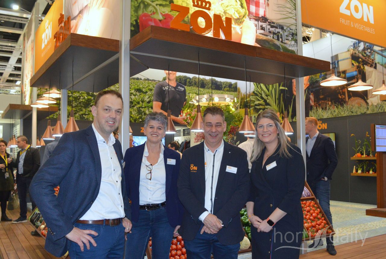 Bij Royal ZON Fruit & Vegetables is het Spaans seizoen nog volop bezig en dat is dit jaar een seizoen met enorme prijspieken vanwege het noodweer. Op de foto Wouter Willems, Els van Herpen, Leander van de Griend en Linda Naus.