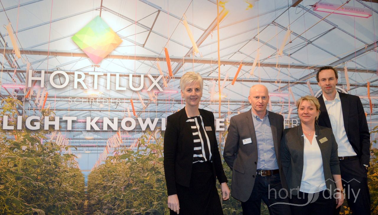 Marcel Weinans, Joyce van der Slik, Tom Zwijsen en Ben Hoogendoorn van Horticoop Technical Services hadden voor de foto even het roze licht op de achtergrond uitgezet.